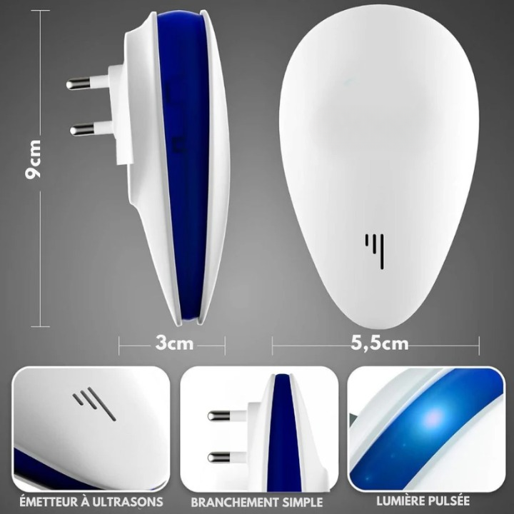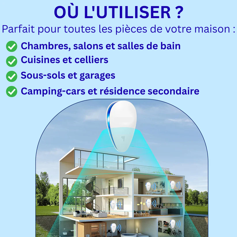 🔹 Remarque : Les ondes ultrasoniques ne traversent pas les murs ni les matériaux solides, il est donc essentiel de bien positionner l’appareil pour une efficacité maximale.